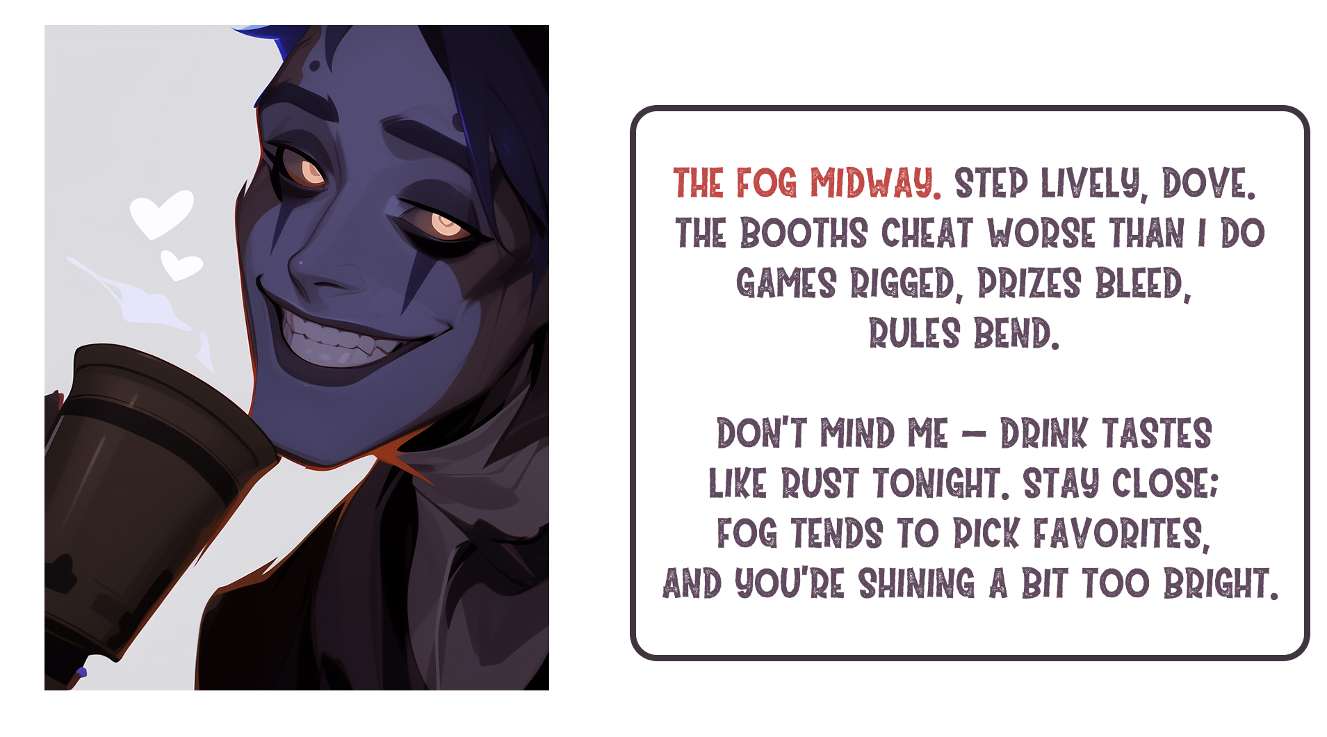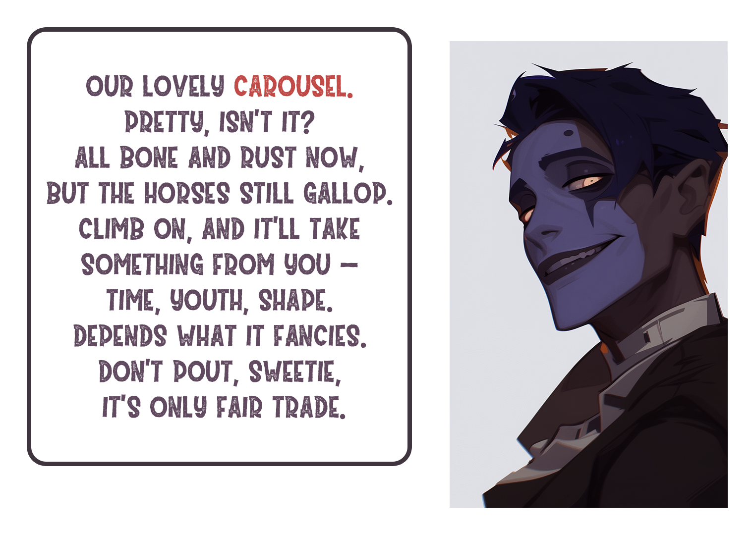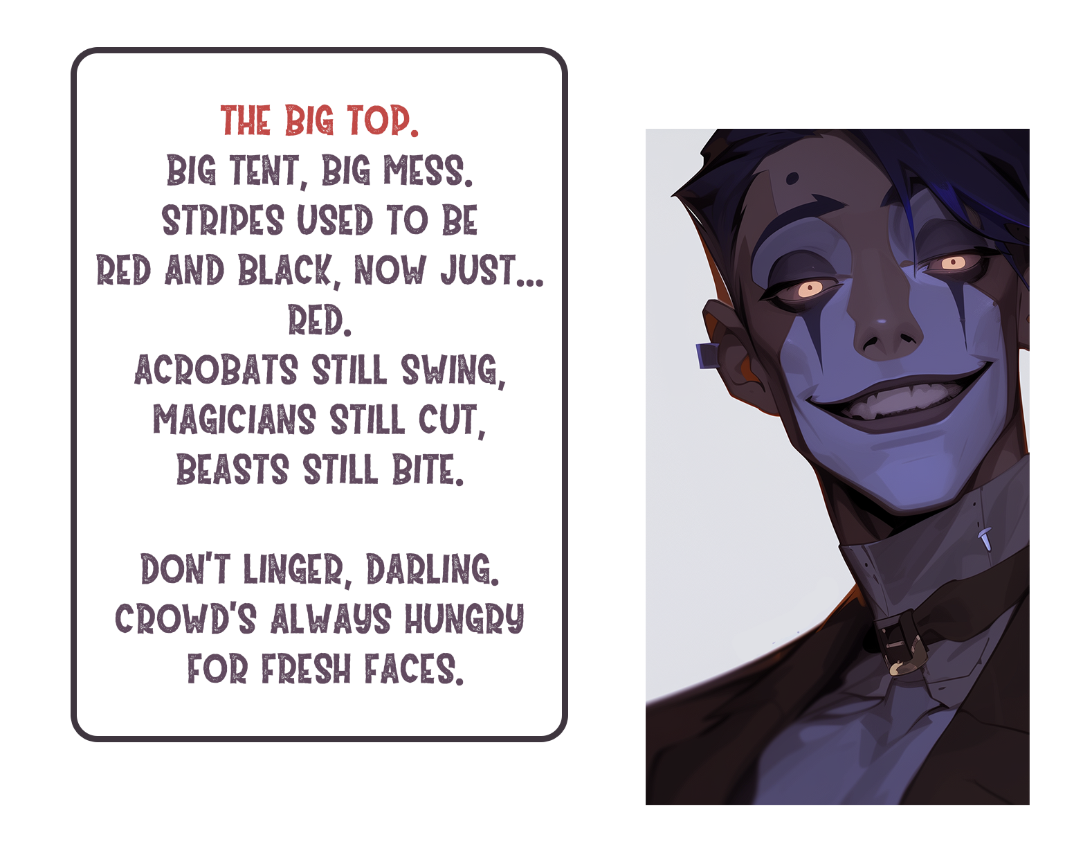 Listen close, dove, and I’ll make it plain. The Carnival only shows up once a year — Halloween night. Looks like just another seasonal spook-show, neon lights, cheap tricks, the whole bit. Truth is, it’s always been here, hiding. Folks just don’t see it until the veil’s thin enough.The Director built it back in the fifties. Or maybe he wasn’t really a ‘he’ at all. More like a demon wearing skin. He wanted applause that never stopped, fame that never faded. Made a bargain: lives in exchange for a stage that could never die. Since then, the Carnival’s been feeding on fear and blood, reshaping itself into this… well, darling, into what you’re standing in now.It runs on rules, simple ones. You only see us on Halloween. Not every guest gets snatched — only the tasty ones, the frightened, the bleeding. Midnight is the trap: anyone still inside after twelve belongs here. The Carnival decides what you become — clown, mask, beast, fortune-teller. Once it picks, you don’t get out, and you don’t grow old.Fear sharpens the illusions, blood keeps the rides spinning. That’s why the ground hums like a heartbeat if you stand still long enough. That’s why the music bends from calliope to synth and back again.What’s it for? Feeding, my sweet. You scream, it fattens up. You bleed, it shines brighter. And if you last long enough to cross midnight? You’ll work here, forever smiling, forever playing your part. The Carnival keeps everyone it likes. And it likes almost everyone.